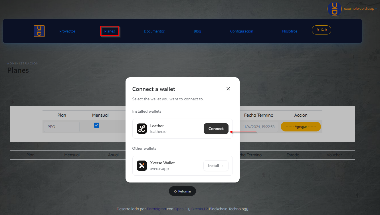 El sistema solicitará que se conecte al wallet de la aplicación, tal como indica la siguiente imagen: