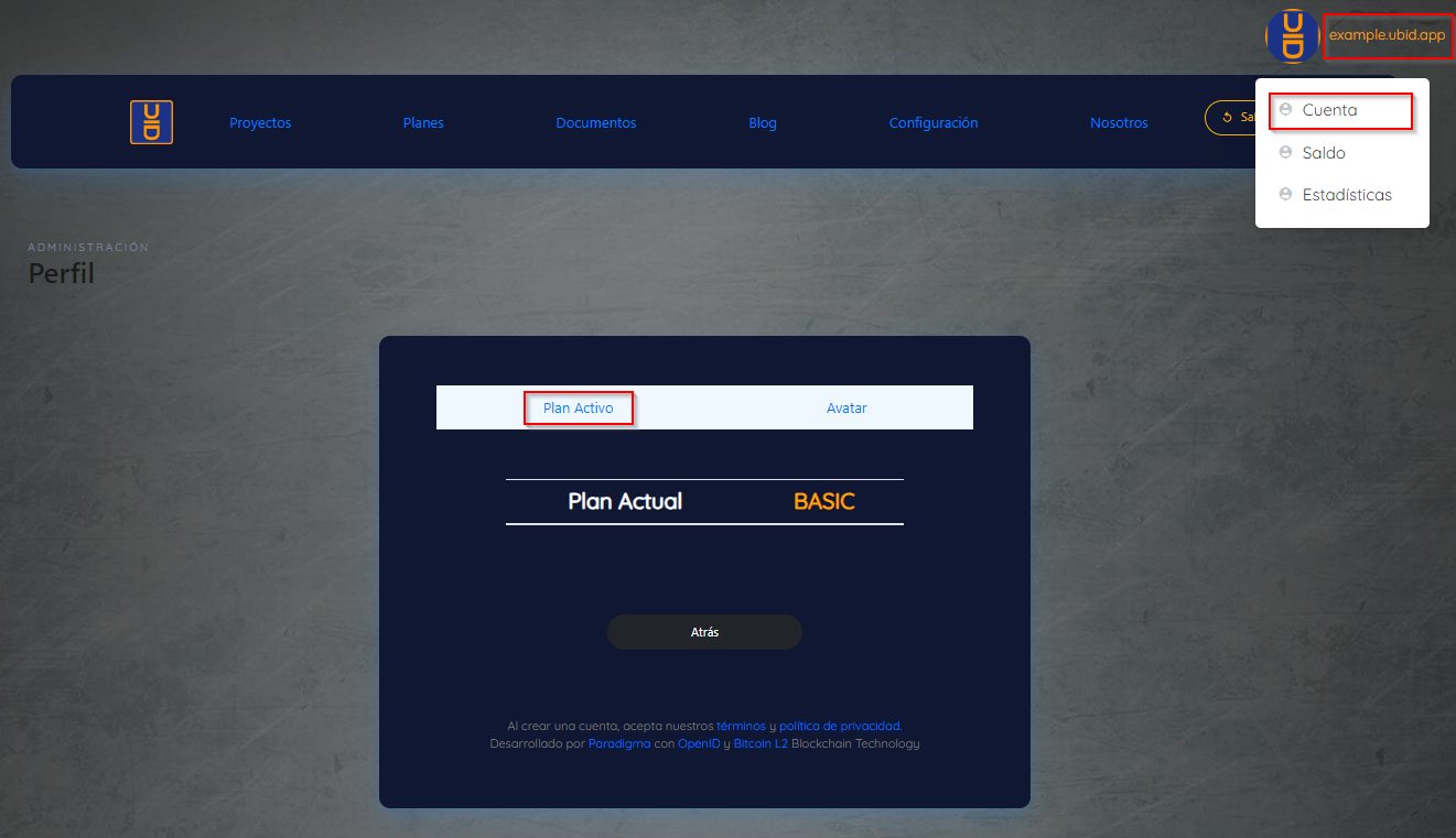Para verificar el plan activo, debe hacer click en el nombre de usuario (arriba a la derecha de su pantalla), se desplegarán 3 opciones, la primera opción “Cuenta“, muestra el plan que se encuentra activo.