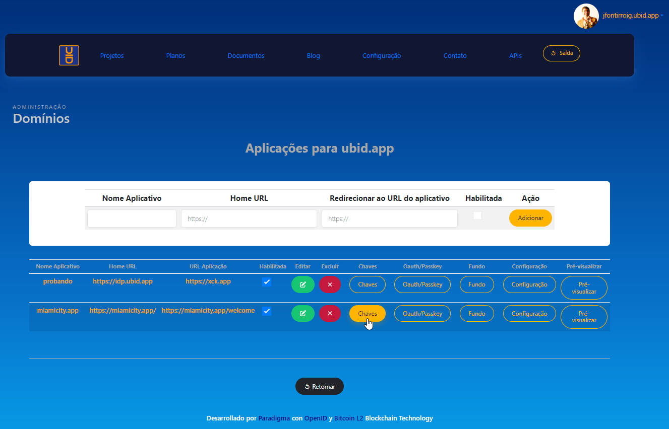 O usuário administrador precisa ter criado um aplicativo para integrar ao ambiente fornecido pelo UbID, como visto abaixo, há dois aplicativos criados pelo usuário administrador.